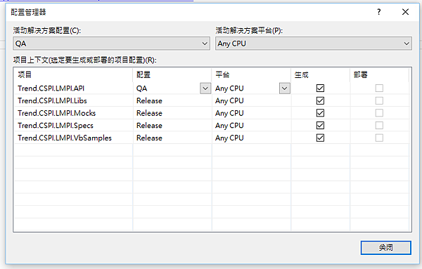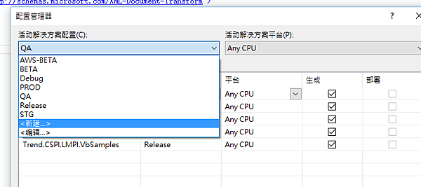2). 開啟環境組態管理視窗,在活動解決方案組態的下拉式選單點一下展開,然後按<新建>新增各環境組態,各組態直接在新建時選擇複製Release組態即可,依此我建置了QA.BETA.STG.AWS-BETA.PROD等環境組態。