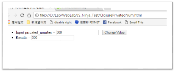 <html> <head> <meta http-equiv="Content-Type" content="text/html; charset=utf-8" /> <Title> 利用閉包封裝私有變數 </Title> <script> function ObjectClass() { var privated_number = 100; this.getNumber = function() { return privated_number;}; this.changeNumber = function(x) {privated_number = x;}; } </script> </head> <body> <ul> <script> function changeObjNumber() { var Obj = new ObjectClass(); var intext = document.getElementById("x1"); var outtext = document.getElementById("x2"); Obj.changeNumber(parseInt(intext.value)); outtext.value = Obj.getNumber(); } </script> <li>Input privated_number = <input id = "x1" type=”text” value="100" /> <button type="button" onClick="changeObjNumber();">Change Value</button></li> <li>Results = <input id = "x2" type=”text” value="" /></li> </ul> </body> </html> |