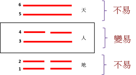另外天地人三才中,天與地不變,代表自然,所以不易;而人有陰有陽,陰陽相沖,造就不同的人格,所以人是變易的,在天地人當中唯一的變數,因此我們的人生必定勢必常變以應時局,這也就是所謂的一陰一陽之謂道。