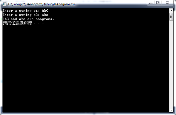 #include "stdafx.h" // Visual Studio as IDE. #include <iostream> #include <string> using namespace std; int countString(const string& original) { int count=0; for (int i = 0; i < original.length(); i++) { count += int(tolower(original[i])); // 把所有大寫字母轉小寫再加總. } return count; } bool isAnagram(const string& s1, const string& s2) { string sorts; if (s1.length() == s2.length()) { if (countString(s1) == countString(s2)) return true; } return false; } int main() { string s1, s2; cout << "Enter a string s1: "; cin >> s1; cout << "Enter a string s2: "; cin >> s2; if (isAnagram(s1, s2)) cout << s1 << " and " << s2 << " are anagrams." << endl; else cout << s1 << " and " << s2 << " are not anagrams." << endl; system("pause"); return 0; } |