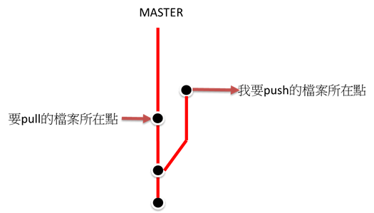 首先是當我打開Source Tree切到要執行版本控制的專案時,發現遠端repository 有檔案需要pull ,於是我打開command 介面下git pull 要把檔案拉回來,卻出現錯誤訊息:大概就是說我本機的檔案修改的分支必需先mergemaster,但因為master線上有一些修改並未反映在我的分支上,所以當我下pull時,該些要pull的檔案與我分支上的檔案衝突,因而我無法pull檔案再commit我修改過的內容然後pushmaster上,我忘記詳細錯誤訊息是什麼了,但可以確定的是我打算要pull時的線與遠端master線呈現如下不同端的狀態: