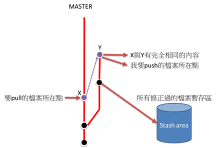其實在git stash + git pull之後,我的支線可以說就是把原本遠端的master線上pull的那個點給複製過來而已,此時我的支線的點的內容與遠端支線的那個被pull的點的內容應該是一模一樣才對。