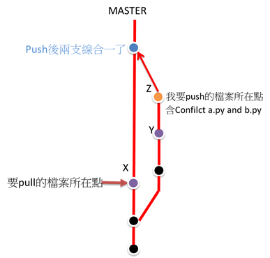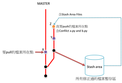 現在只要把a.pyb.py用本來在下git stash之前的本機拷貝檔覆蓋過去,那麼Z點就完全與當初要push的那個點的內容一模一樣了,只要再git commit 然後git push到遠端master,那所有更新的成功了。
