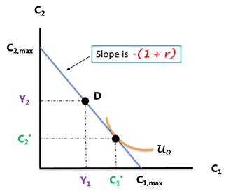 - 時間偏好率 大於 利率時, 應該 增加 C1 消費 減少 C2 消費;