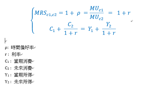 - 時間偏好率 小於 利率時, 應該 增加 C2 消費 減少 C1 消費;