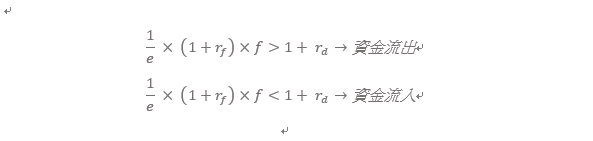 首先,我們應該了解到套利行為會發生在利率平價理論不平衡的時候。亦即是說當外國貨幣的一年的本利和>本國貨幣本利和 時,因為換成外幣存錢比用本幣存錢有價值,所以資金流出;相對的,當外國貨幣的一年的本利和<本國貨幣本利和時,則存本幣收益較外幣高,故資金流入。