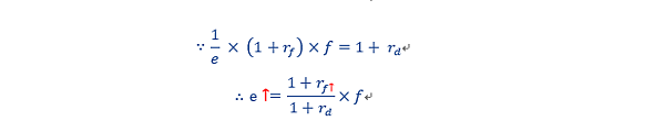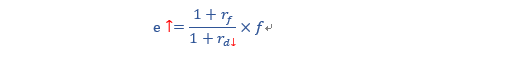 所以,假設USD為外幣,NTD為本幣時,若美國利率(rf)上升,則匯率e會上升(台幣貶值)。