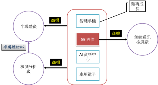 半導體業在看好 5G設備 AI資料中心 車用電子 發展的情況下,雖然在手機市場需求已難有成長的情況下,仍將因應於5G等電子設備製造的趨勢而需要投入大量半導體材料,這將使專做半導體材料檢測分析的廠商受惠,以台積電為例,與之密切的合作檢測廠商閎康業績即表現亮眼,其主要可以幫助台積電進行第三代半導體材料如氮化鎵(GaN)、碳化矽(SiC)、5G通信世代半導體材料分析、可靠度分析。