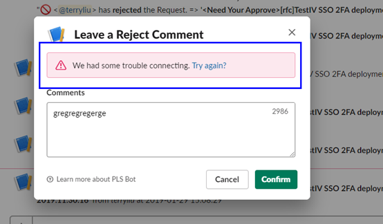 要在slack 上串起這個功能其實不難,只要添加個Dialog讓Manager可以在按下Reject Button之後可以彈出讓其輸入Comment再按下確認即可。如此再回覆給RFC 訊息發出人的自動訊息中就會加上Reject Comment在訊息上。