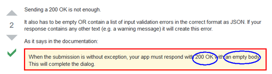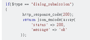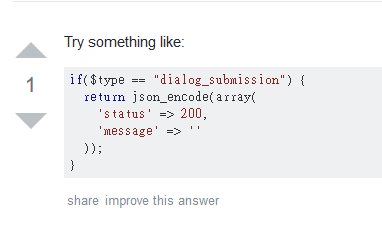 但這不是問題的解法,我照這種作法在處理對話框” dialog_submission” event 的code中試好了多種不同回應,但最終仍會看見 {"ok":false,"error":"dialog_invalid_response_json"} error response。 這代表我為 ” dialog_submission” 回應的 response 資料格式一直是有問題的,而該文中提問者確實也未解決他的問題。