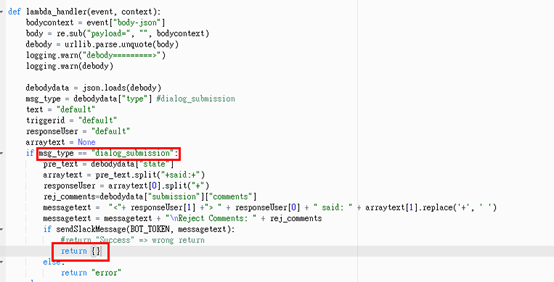 用 return {} 之所以會成功主要是因為我用的是在 AWS API Gateway 上的 python 語言,lambda_handler function沒拋出exception 便代表 return http status code 200 , 此時在 lambda_handler function 裡 return 任何東西都會被帶上 http response body ,自然就被視為 我的程式告訴 dialog_submission 我對於Dialog要求submit東西的事件處理失敗!