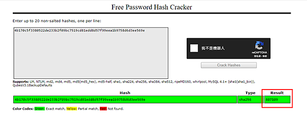 - 但因為取得的密碼是SHA-1 hash過的,所以必須將密碼用線上工具還原,打開CrackStation.net頁面貼上hash code即可透過查表方式還原sha256密碼。