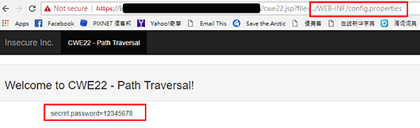 - 此時頁面秀出部分重要的web.xml內容: insecureinc index.html index.htm index.jsp default.html default.htm default.jsp CWE22 insecure.inc.Cwe22Servlet passwordFile WEB-INF/config.properties . 這些內容都是可以參考的檔案,而儲存敏感帳密資訊的檔案(config.properties)便在其中,只要再改變url參考到該檔案即可秀出帳密資訊在網頁上。