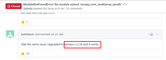 嗯….. 看起來是跟numpy package有關的error,於是用pip install numpy測了一下是不是沒有裝到numpy這個套件,但發現已經有安裝numpy 1.15 版了,之後再上網查一下發現有人說只要把numpy升到 numpy 1.16 版就好了,於是我用pip upgrade了numpy到最新版: