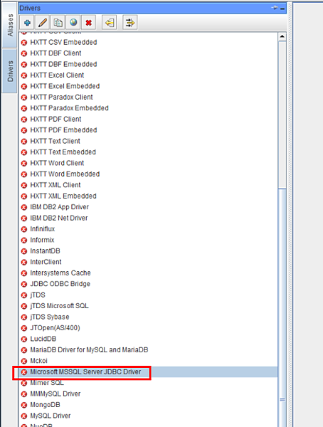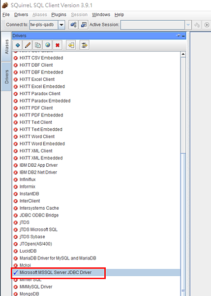 但在真正可以開始使用之前還有一大段路要走,首先你可以打開Drivers tab,,你會發現一件很可怕的事,裡面全部都是XX ,這是為什麼呢? 因為SQuirreL 是一個開放的DB Client,它並不預設綁定任何DB,但你可以透過安裝所需要查詢的DB的Driver來綁定SQuirreL與DB軟體,最好的例子就是我們這邊所要綁定的MS SQL的Driver,看下圖可以知道目前Driver是空的,顯示紅XX,所以我們得先綁定MS SQL Driver到SQuirreL Client中: