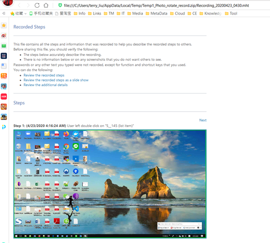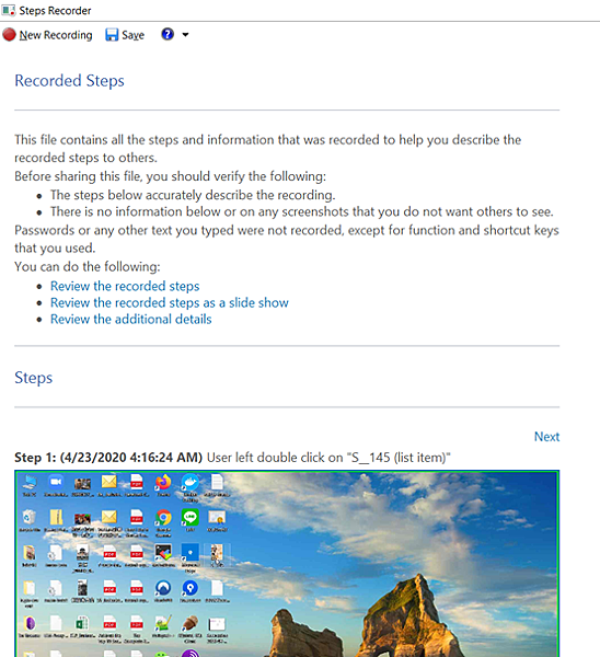 好家在Windows 10 有一個好用的內建App叫”Steps Recorder”,可以幫你錄製某一段電腦操作過程,並且每個操作步驟都會幫你自動家說明與截圖,最後可以儲存成為一個壓縮Zip檔,這個Zip檔會儲存一個MHTML(.mht)文件,裡面會包含你的windows操作過程所有被錄製的步驟,然後用Web Browser即可打開檢視,那麼你就可以請朋友利用這個Setps Records app把他遇到問題的操作過程錄製下來存成Zip檔然後Line給你,你就可以完全掌握朋友的操作過程並比較能判斷事情的發生原因進而幫他解決問題啦!