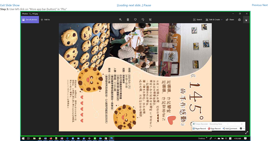 在上圖中可以看到你剛剛錄製的每一步驟內容跟截圖,你可以往下滑一步一步地看錄製的每個步驟,也可以點擊畫面上的: Review the recorder steps as a slide show,會用整頁模式輪播每一個步驟錄製的步驟給你看,以下是某些步驟的slide show畫面:
