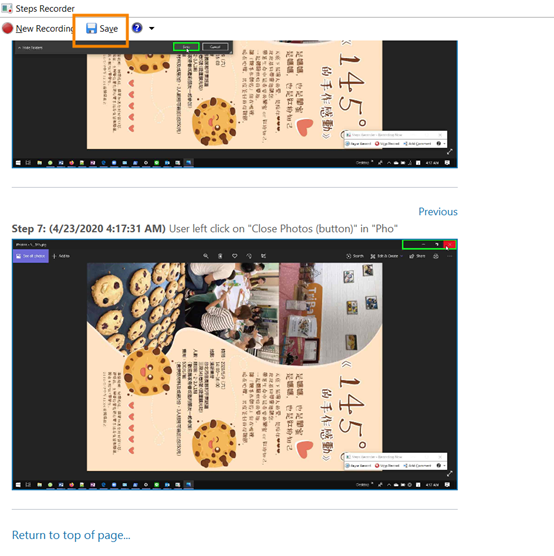 - 總共有7 step被紀錄,沒問題就可以直接按Save輸出Record檔案,同時預設會是儲存成Zip File。
