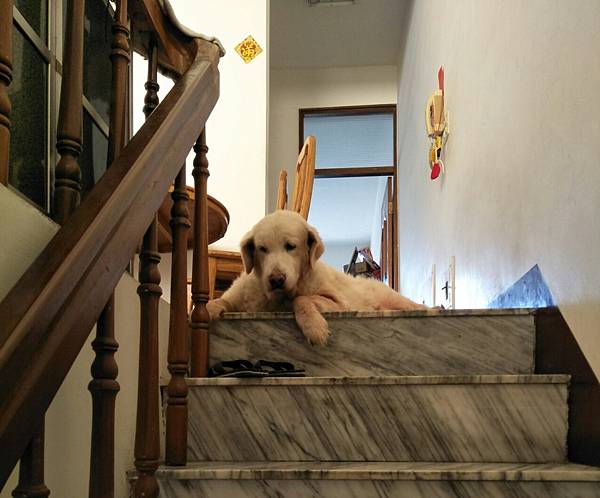 [貝兒很喜歡趴在樓梯口看著站在樓下的我們]