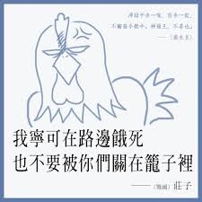 生活在籔澤的雉鳥山雞寧願走十步一啄食,走百步才飲口水,也不會希望自己被人養在籠子中。(原文:澤雉十步一啄,百步一飲,不蘄畜乎樊中。)因為雖然被人養在籠中像做帝王一樣不愁吃喝,可是到頭來失了自由也是不美好呀。