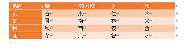 元,表乾元之始,是萬物的初始之態,故應時者為春,應空(方位)者為東,應物者為木,應人者為仁。仁為人之根本,而根本取之於木,一年四時則始於春,東方則是太陽昇起之正位。