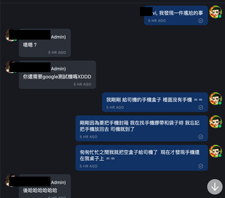 事情是這樣的,因為身邊有一支 Google 測試機在這次資產盤查之後覺得應該是可以先繳回給公司了,所以ADM 的小姐姐幫我叫了個快遞小哥到我家回收我的測試手機,這小哥速度挺快,ADM開好外送單不到十分鐘他就來電叫我下樓說要取件了。