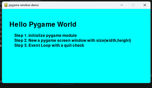 pgWindow.blit(pgWindowText, (30,50)) - Step 3. 執行無限迴圈監聽quit event, 當 quit Event 被捕捉,執行關閉程式的任務,最後無限迴圈必須透過函數 pygame.display.update() 執行必要的刷新視窗內容功能。