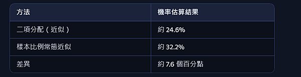 - 連續校正影響:二項分配使用連續校正(如 X > 6.5),而樣本比例直接估算