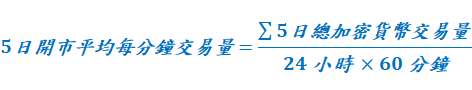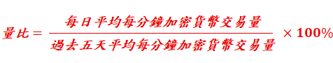 - 加密貨幣: 每日平均每分鐘加密貨幣交易數量 對 過去五日平均每分鐘加密貨幣交易量 的比率。