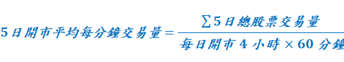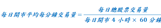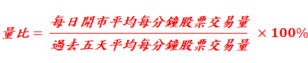 - 股票: 每日開市的平均每分鐘股票交易數量 對 過去五日開市平均每分鐘股票交易量 的比率