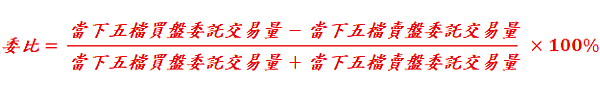 - 股票: 當下五檔買盤委託數量 – 當下五檔賣盤委託數量 對 當下總委託訂單數量(當下五檔買盤委託數量 + 當下五檔賣盤委託數量) 的比率