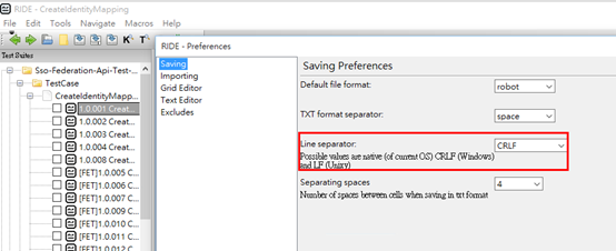 所以我就到 RIDE -> Tools -> Preferences 中設定 Line Separator 為 CRLF,然後……………………… 就莫名奇妙可以存檔了……………. 此時心中真是忍不住大喊: Whaaaaaaaaaaaaaaaat Theeeeeeeeeeeeeee Fucccccccccccccccccccck!