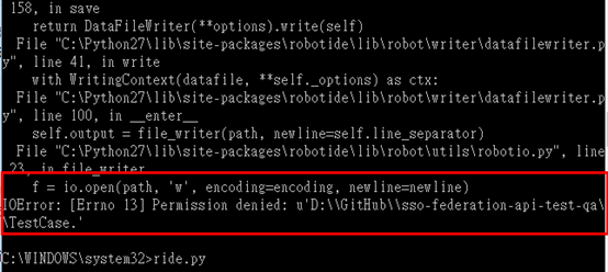那到底原因是什麼呢? 不能存檔那我的Automation Test Case是要寫個毛呀? 後來也不知道哪來的靈感,我去看到了Command Line Window有寫了相關的Python Exception:結果是IO寫入的Error,我也注意到 f= io.open(path, ‘w’, encoding=encoding, newline=newline) 這一行敘述,就是這一行引發終極Error的。